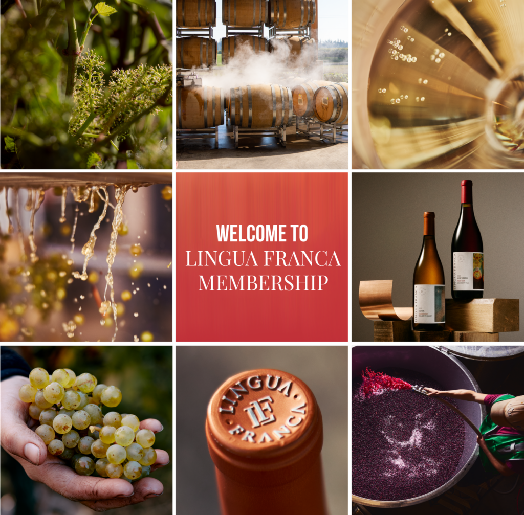 Members in good standing also enjoy a complimentary Lingua Franca experience tasting for up to 4 people once per quarter; access to member-exclusive events; preferred pricing on purchases (10% savings on 6-11 bottles and 15% savings on 12+ bottles); and shipping perks (flat-rate $25 shipping on up to 5 bottles, and ground shipping included on 6 or more bottles). Experiential benefits are always transferable through our Friend of a Member program.